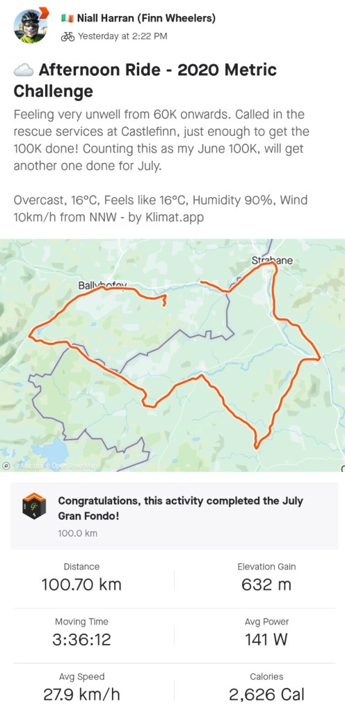 I pulled into a shop, got a cup of tea to try and settle my stomach, worked out that 10K would take me to Castlefinn and made arrangements for Catriona to come and pick me up there. With that decision made and a bit of relief from the breeze I pushed on with my head down and simply ground out the final 10K to get across the 100K line.