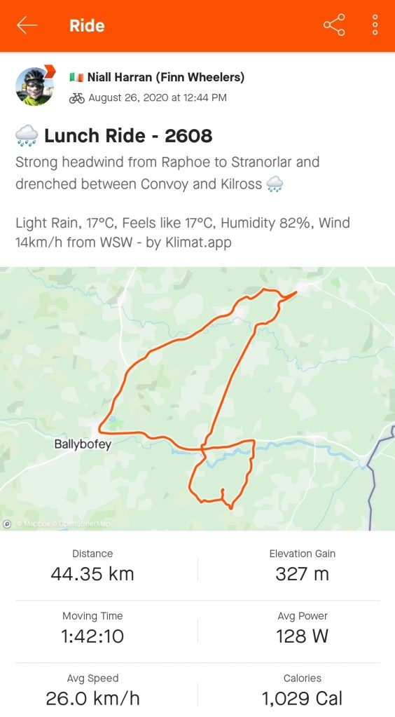 Wednesday was my day off and I was able to coordinate my spin with a dry weather window. It was still pretty windy but this was expected. What I didn’t expect was the heavy downpour between Convoy and Kilross that left me soaked through and killed most of the fun of the ride.