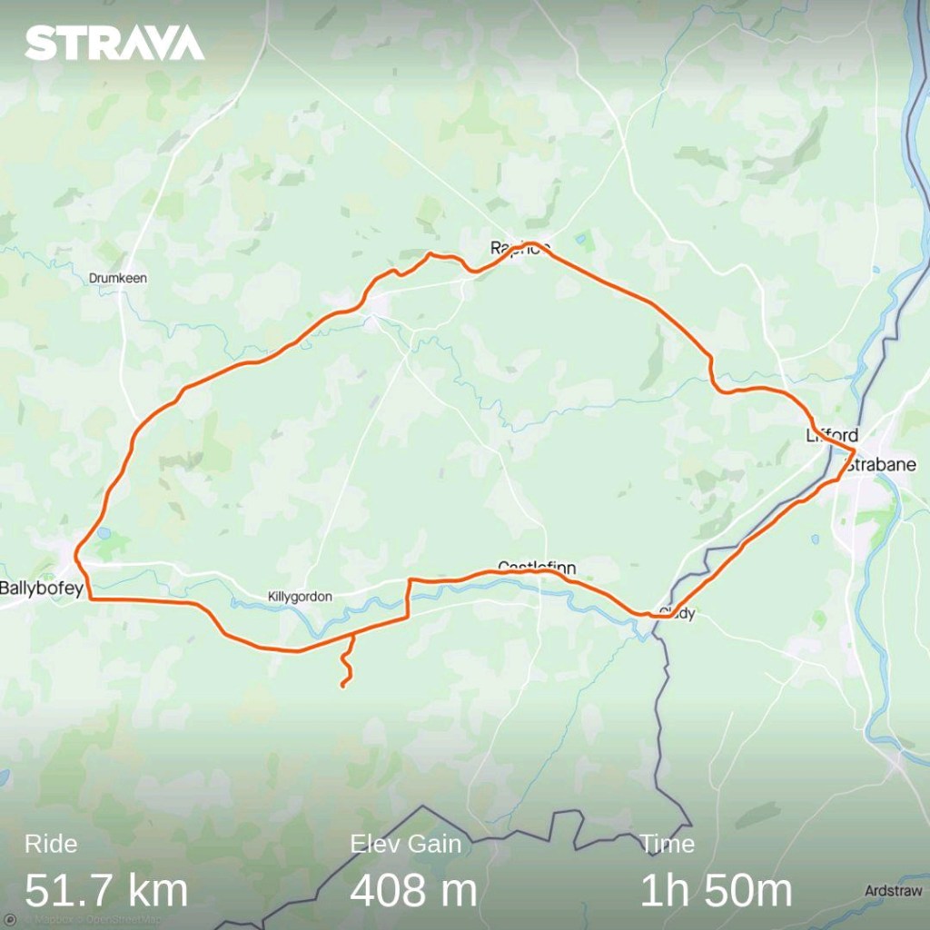 Sunday was the best spin of the whole month. It was a Club event and completed a full lap of the River Finn. It was to replace the Covid19 cancelled Lap The Lough and called Lap The Finn. It was a really good social day, my first Club spin since February and at 128km my longest spin since November 2018.