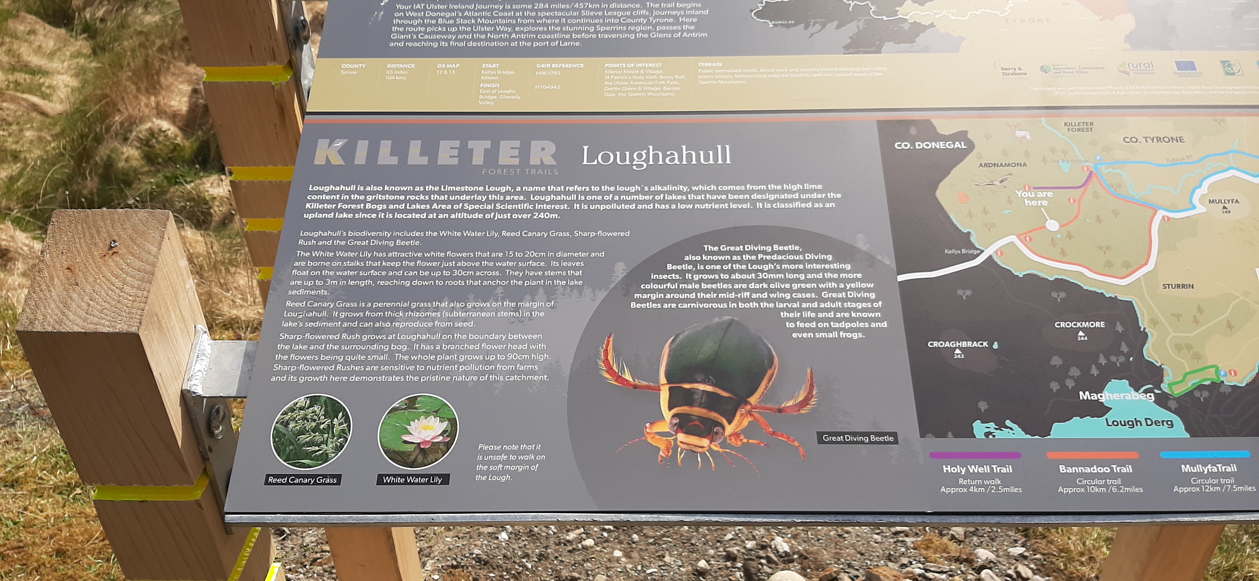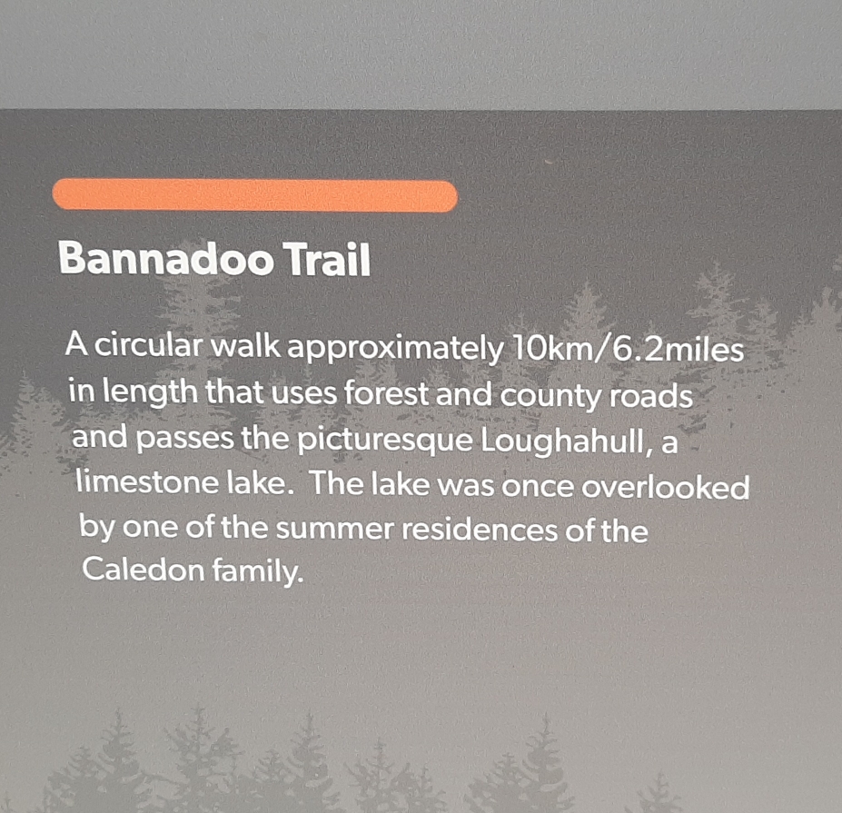 The walk turned out to be almost 11km including the short walk from the car park area to the start of the loop. Most of it is through mature plantation so the views are minimal but there’s a beautiful lake in the last couple of kilometres as well as the site of the former Derg Lodge. Although I missed out on a cycle it was a worthwhile change of plan.