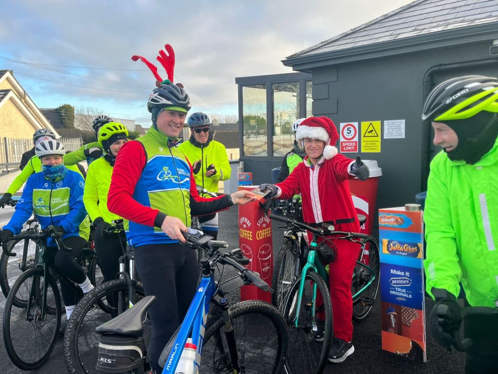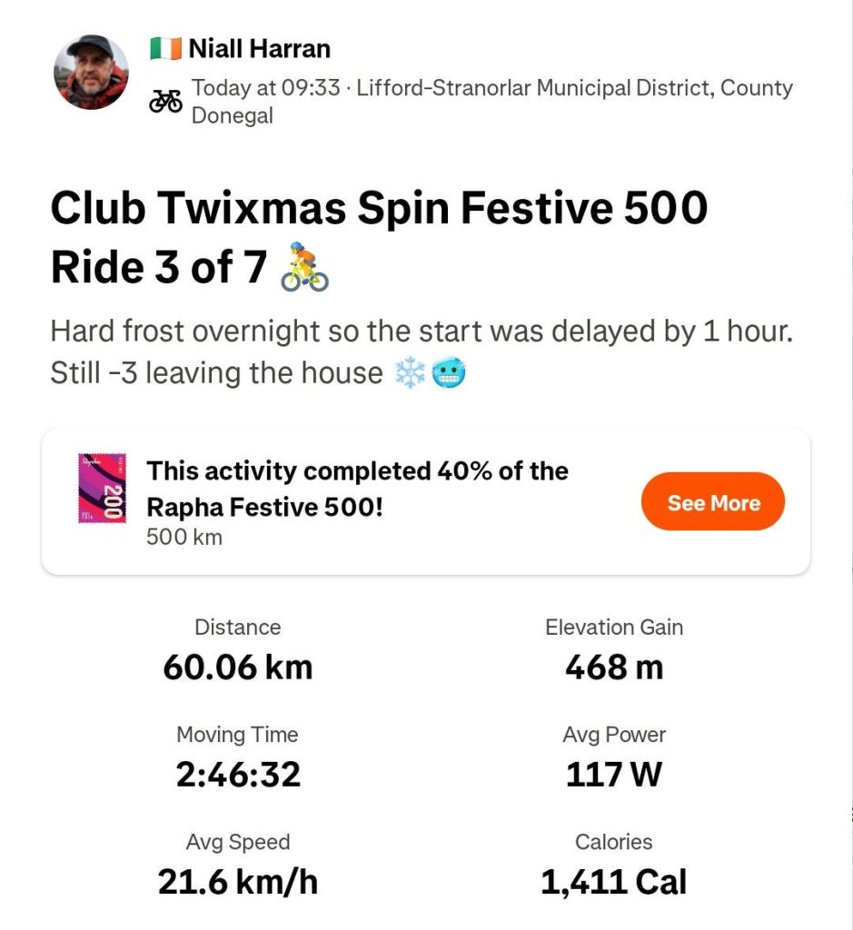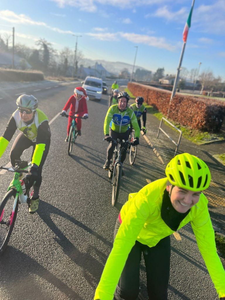 I was a wee bit nervous setting off but despite white roads they were dry and the surface frost wasn’t slippery at all. Grainne cycled down the road to meet me part way and to get some extra km for the day. She made a big effort, coming decked out on a full Santa outfit and picked up the prize for most festive bike/rider 🤶