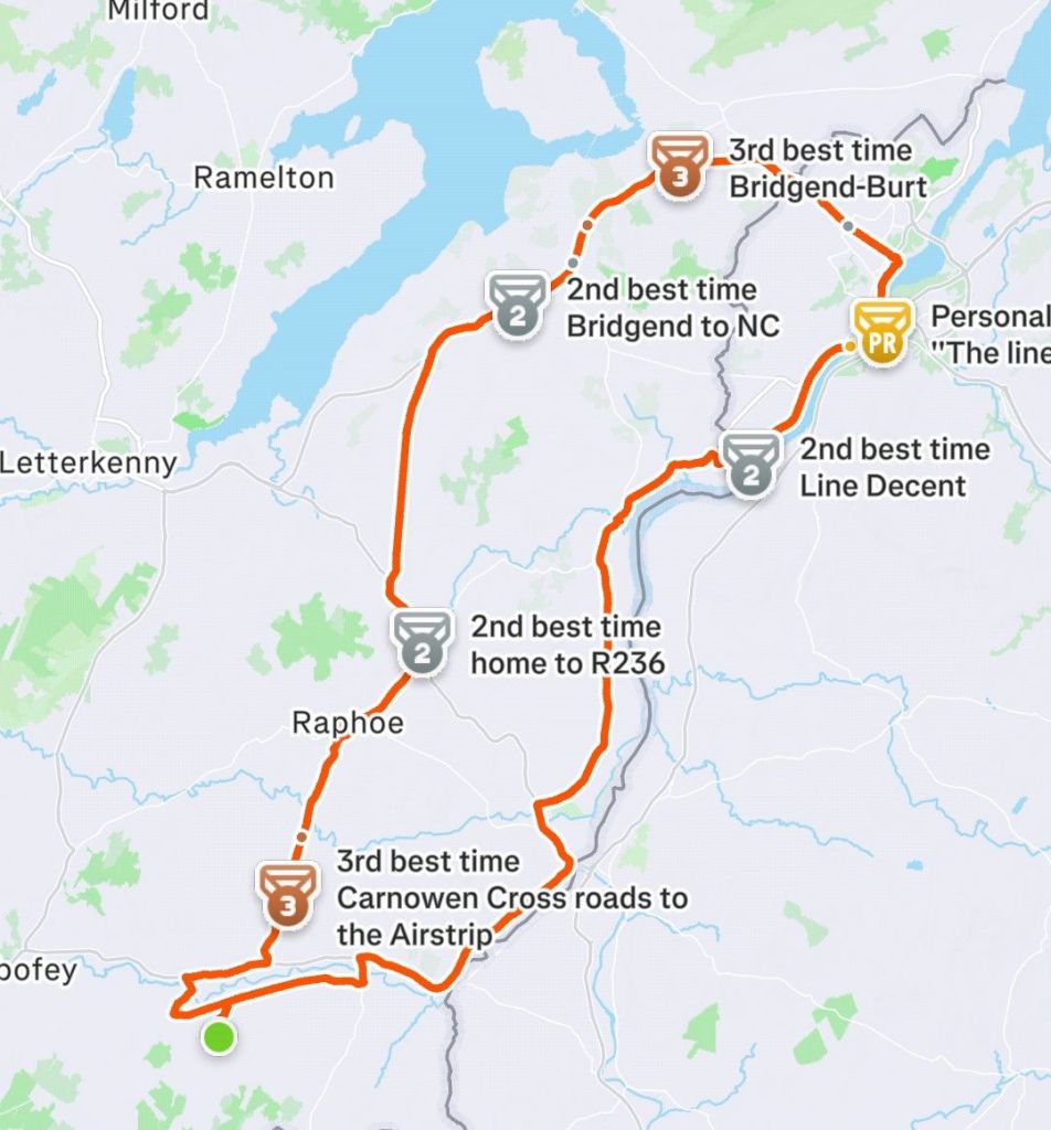 The amendment was at Raphoe. Instead of doing The Broadpath climb into Stranorlar yet again, I decided to head across country via Carnowen and into Liscooley. Instead of going straight home I went as far as Killygordon village before crossing the river to give me an extra 5km and 96km in total for the day.