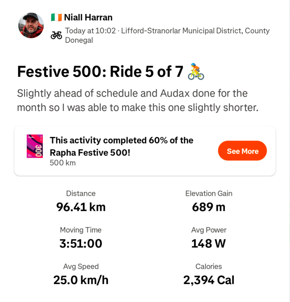 Today’s route was basically a repeat of Xmas Eve and Day 1 using my East Donegal Audax route. However, with some extra distance in the bank from the first 4 days I decided to shorten it slightly.