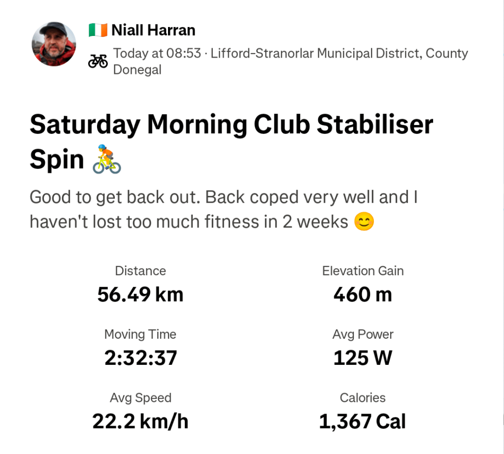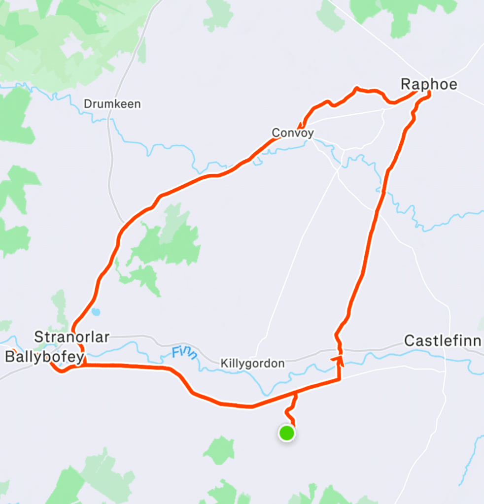 The route took us into Raphoe via Liscooley which has a few punchy climbs to further test my back when putting down extra power and climbing out of the saddle. All still good π