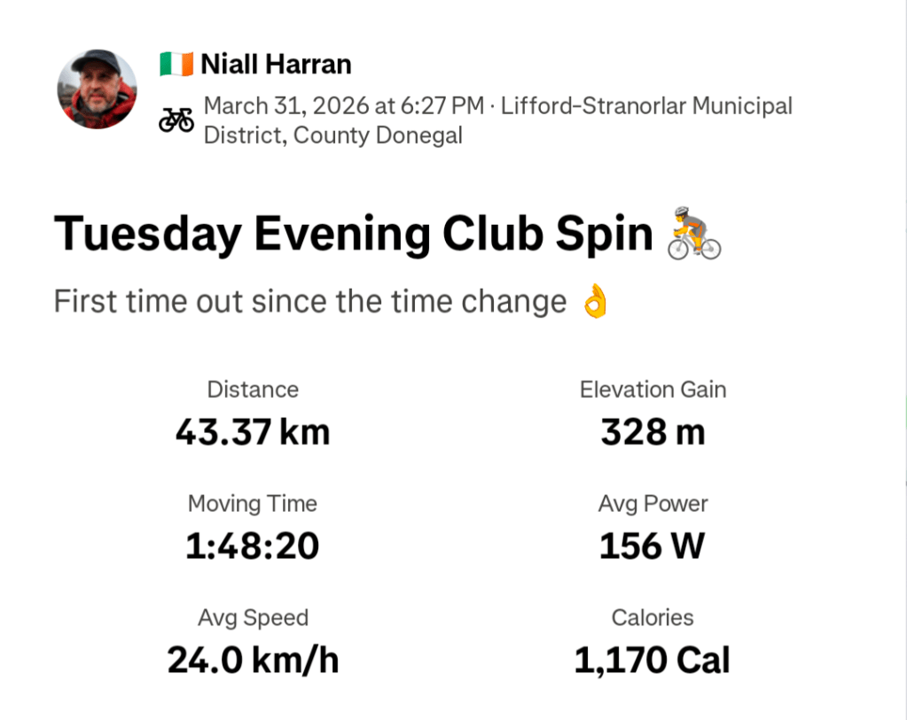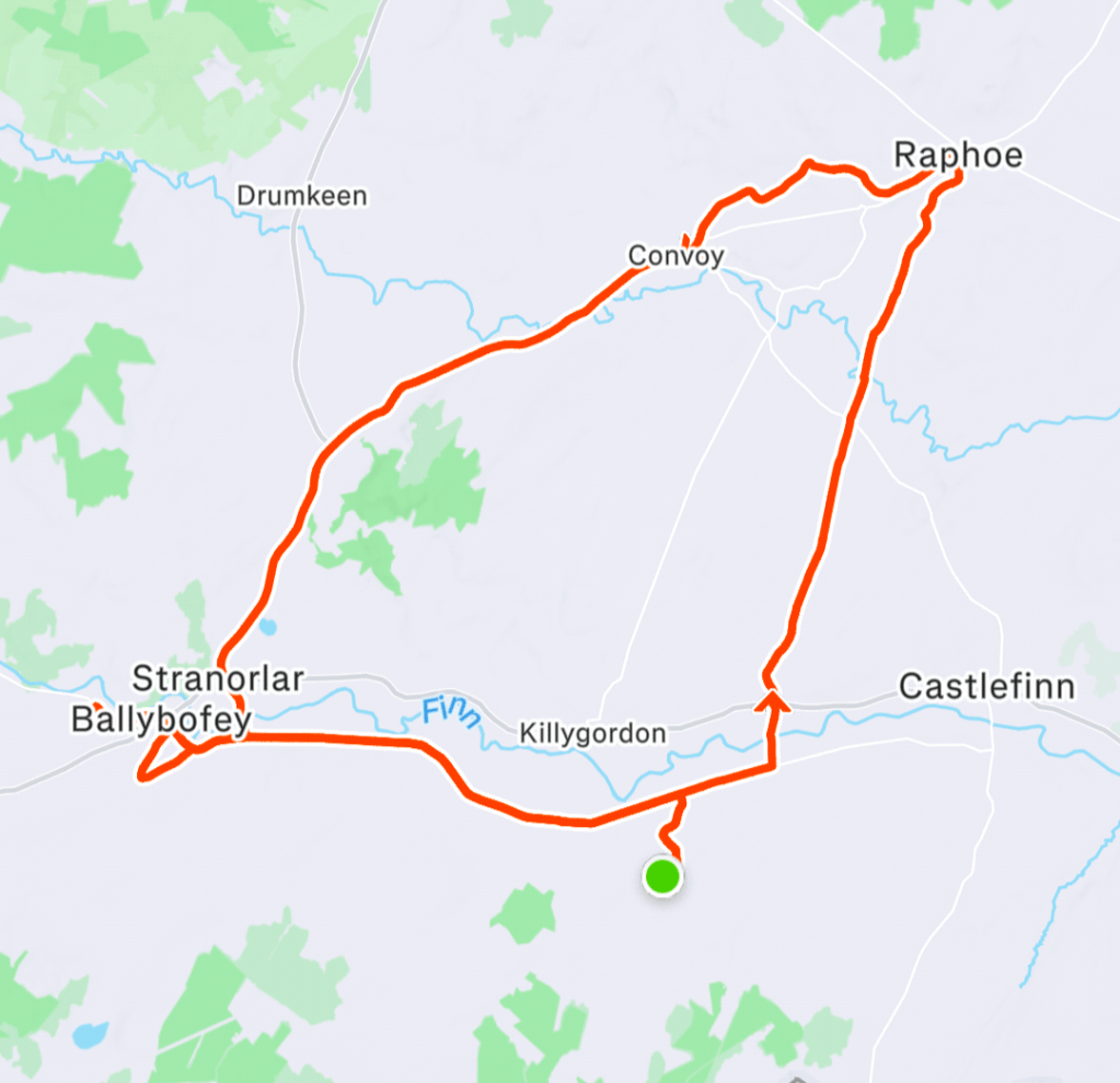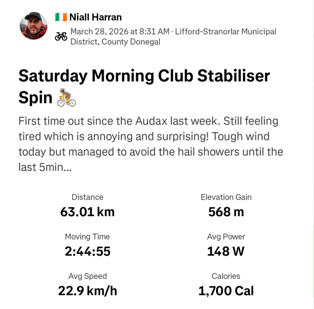 March 28th (one week after the Audax) I got out with the Club for 63km. I cycled up to Ballybofey, did 40km with the Club Stabiliser Group and cycled home again. It was quite a windy day and wasn’t easy but I was shocked how tired I was during and after the ride!