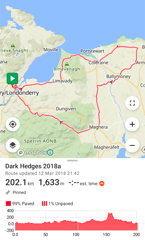 The most constructive thing I did last week was to decide to change my Audax plans. With the clash with work the 18th just isn’t feasible. Looking at the Calendar though I’m limited with options. There are only three 200km events in the year for Ulster. The one in September has way too much climbing taking in Torr Head in Co. Antrim. This leaves me with one other option which is on 26th April. It’s the Dark Hedges 200. This is a route I’ve ridden as an event before and one I’ve done as a Permanent a few times. At 1800m of climbing it’s more than I’d like to be doing but beggars can’t be choosers and it’s only(!) 600m more than Larne. I’m hoping that familiarity will compensate for the climbing.