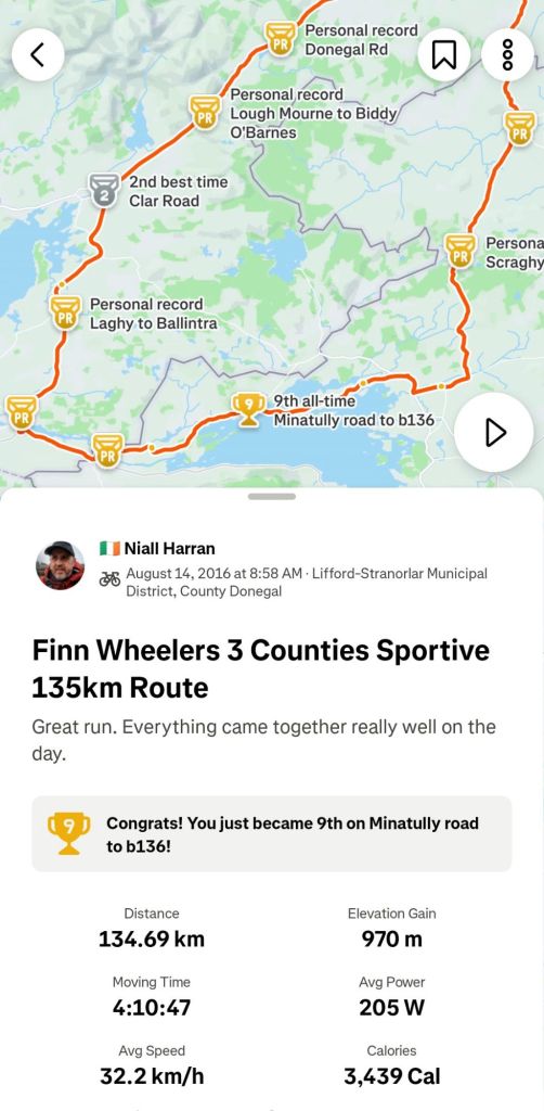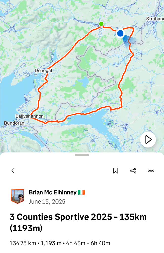 My condition in 2016 was very different compared to 2025. As well as having 9 years less on my clock and being at least 10kg lighter, I had a lot of training done. In the 12 months leading up to the Sportive I’d ridden just over 7,500km and completed a lot of rides of 100km+. One of those was the Wicklow 200 which I completed in just under 8hrs 15min. I’m nowhere near that at the minute so I guess that’s my target set for the next 12 months 🤣 I’m definitely riding that route myself in the Spring too!