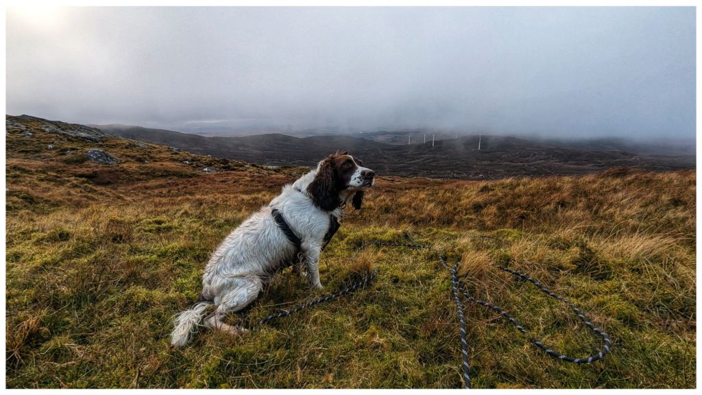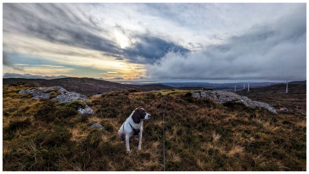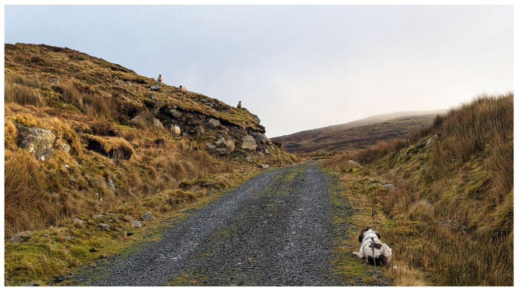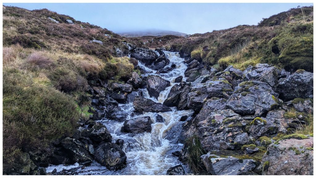 Across the lough and it was straight into open hillside. I should know better by now but I had expected better ground than what was in front of me. The Bluestacks are renowned for heavy, wet and boggy terrain but above a certain height it tends to be drier and rockier making for really nice walking. Today I had about 100m to go to get onto the good ground and in between it was some of the most difficult I’ve crossed. A constant mix of peat hags, boggy sections and cut by small steep ravines that knocked my legs for six! I was still hyper alert for wandering sheep so I’d kept Cooper on the long lead and it was a constant challenge to keep it from getting tangled in my legs and from getting caught on rocks and clumps. He had his own ideas about the best way to navigate this terrain and at 10 times the speed I was moving!