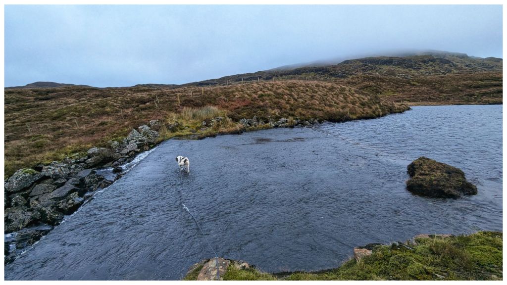 The reservoir appears to be a small lough that has been dammed at one end to create both a larger lough and a controllable stream that has a small hydro plant close to where we started. From the map I wasn’t sure how to cross the outflow end but there’s a large concrete wall that acts like a ford. I’m not sure how deep this gets but it was only a few inches deep today and easily crossed.