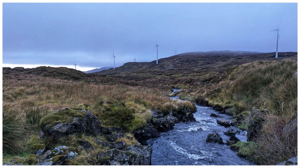 Rather than head back the way I came I decided to drop off the summit staying above the route in and heading for the highest of the windmills. This brought me roughly parallel to the planned route across to Carnaween but at a lower elevation and with an easy finish back along the windfarm tracks.