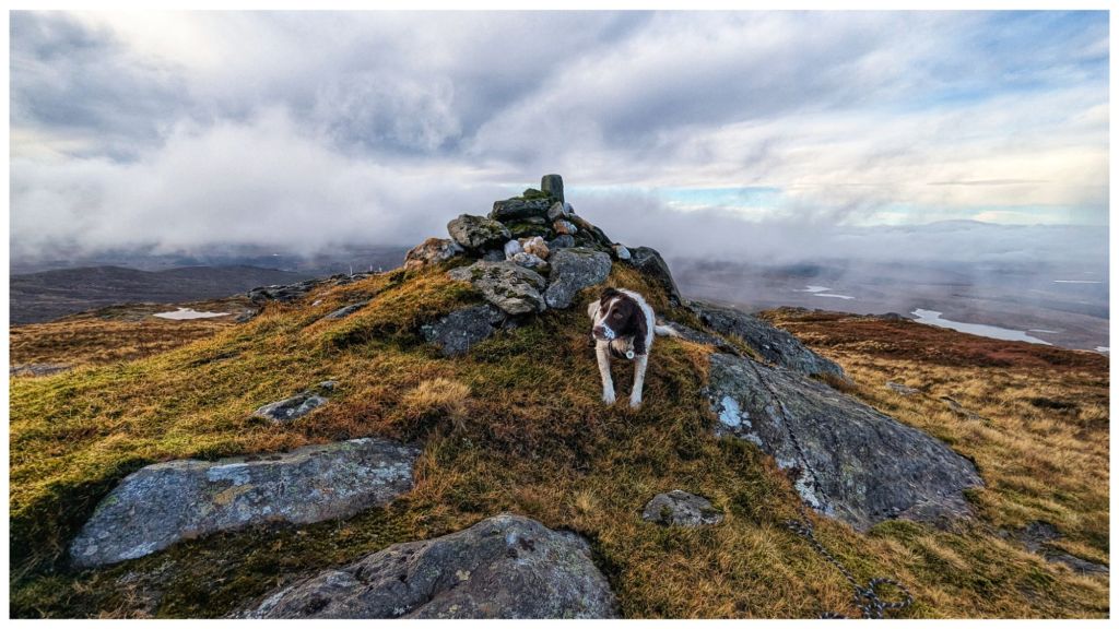After the inevitable false summit at 550m 🙈 I got sight of the summit with a distinctive rocky cairn built on a small crag. A very regular shaped rock has been inserted into the cairn. Covered in moss, it has obviously been there for many years but gave a strong impression that it was a man made mini trig.