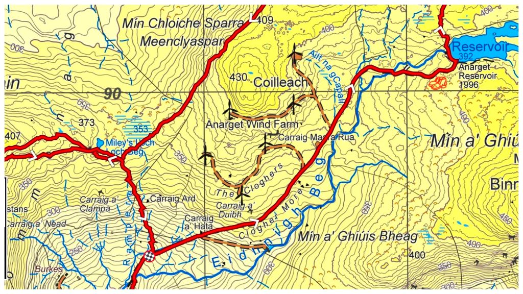 The first section is along access tracks for the windfarm that sits on the lower slopes between Silver Hill and Carnaween. It’s simple walking but steeper than I expected as it rises steeply from 200m along the Eany Beg Water to the Anarget Reservoir at just under 400m in just under 3km.