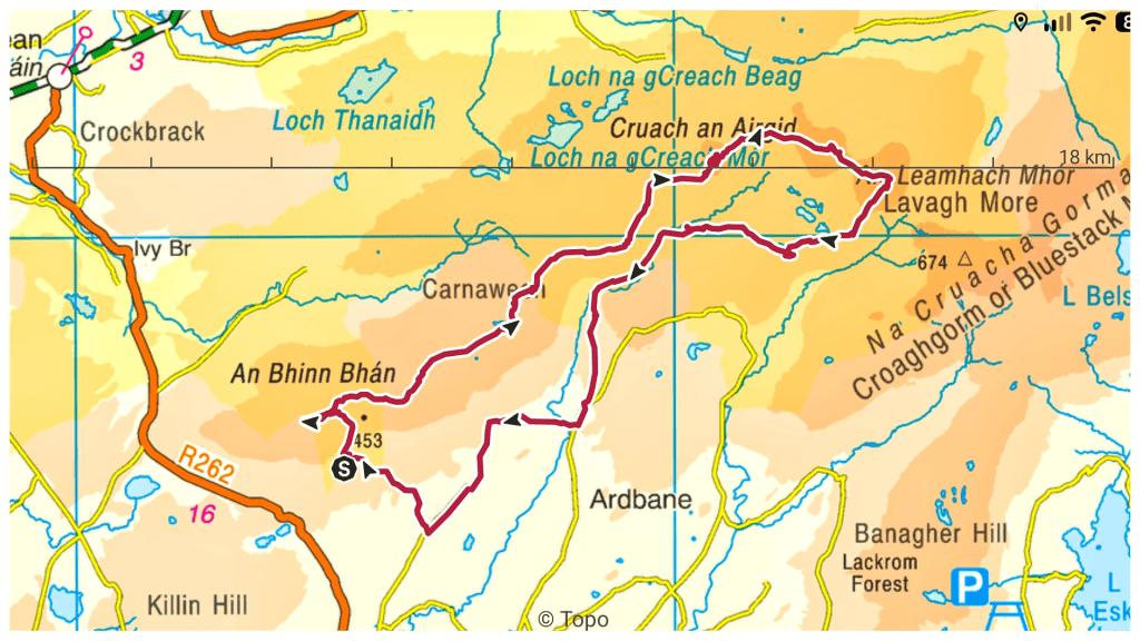 With limited daylight I wanted something relatively easy and not too long so after a trawl through my saved routes I found one that fit the bill in the Bluestack Mountains taking in two summits I haven’t been on before and at 10.5km manageable in about 4 hours.