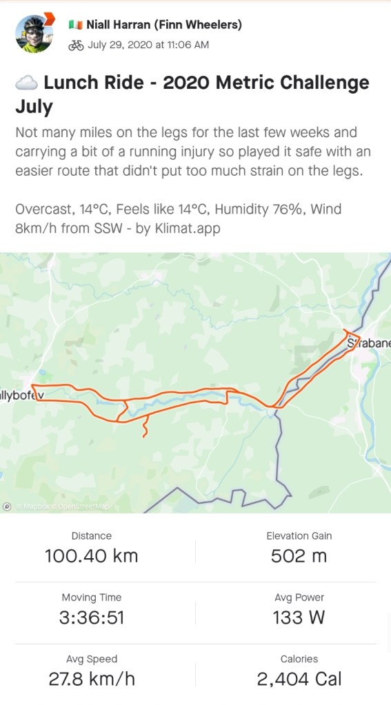 I wish I could say I enjoyed it but it was just grand to be honest. As I haven’t cycled much this month and I’ve picked up a running injury I didn’t want to take on anything with too much climbing. The best option for this was to stay in the Finn Valley between Strabane and Ballybofey doing two repeats of a 50K route, basically a repeat of my February metric spin, but without the snow! It made for a less intensive ride but unfortunately also a less interesting one.